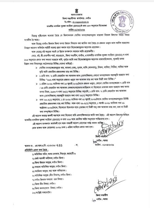 নগাঁও: নগাঁৱত এতিয়াৰ পৰা মন গলেই ধৰিব নোৱাৰিব যিকোনো মাছ। আনকি ইচ্ছা অনুযায়ী বিক্ৰীও কৰিব নোৱাৰিব যিকোনো মাছ। কাৰণ মাছ ধৰা আৰু বিক্ৰীৰ ক্ষেত্ৰত জিলা প্ৰশাসনে জাৰি কৰিছে নিষেধাজ্ঞা। প্ৰজননৰ সময়ত কৰা মৎস্য চিকাৰে মাছৰ বংশবৃদ্ধিত অতি নেতিবাচক প্ৰভাৱ পেলাই ইয়াৰ উৎপাদন হ্ৰাস কৰাৰ প্ৰতি লক্ষ্য ৰাখি নগাঁও জিলাৰ আয়ুক্ত দেৱাশীষ শৰ্মাই ভাৰতীয় নাগৰিক সুৰক্ষা সংহিতাৰ ধাৰা ১৬৩ ৰ অধীনত মাছ ধৰাৰ ক্ষেত্ৰত কেতবোৰ নিষেধাজ্ঞা আৰোপ কৰিছে (Fish Catching Ban Nagaon)।